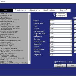 Abrir y cerrar turnos, cierres temporales y resumen de lo operado por cada turno, abrir o cerrar barreras, informes financieros y estadisticos, Libro de IVA.
